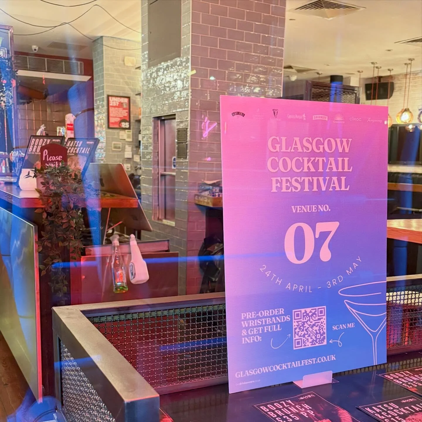 Located in Mitchell Lane, Glasgow, the venue offers a vibrant atmosphere with colorful artwork and quirky signs, creating an upbeat vibe.